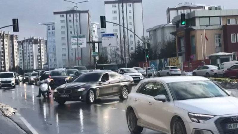 00:14Çeyiz mağazası açılışında izdihamBaşakşehir Başak Mahallesi'nde cumartesi günü öğleden sonra ilerleyen düğün konvoyundaki yaklaşık 15 araç ilçe emniyet müdürlüğü önünden geçerken durdu. Bir sürücü aracıyla trafiği kesti. 34 TC 0280 plakalı aracın sürücüsüyse kesilen yolda patinaj çekmeye çalıştı. Bu sırada yoldan geçen bir motosikletliye çarpmak üzereydi. Motosikletli kurye yolun kenarında durmak zorunda kaldı. Bir şekilde o konvoyu geçebilen araç sürücüleri tehlikeyle karşı karşıya kaldı. Drift yapmaya çalışan kişi yolun istikametinin tersine dönerek hareket etti. Bir kaç dakika sonra konvoy kornaya basarak yolu açtı. Konvoydakiler yollarına devam etti.