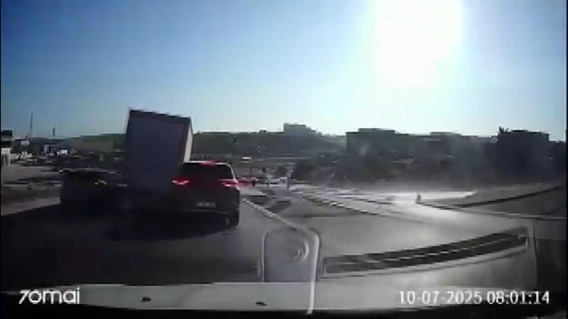 10 aracın karıştığı kaza anı bir otomobilin araç içi kamerasına yansıdı. Görüntülerde hızla gelen kamyonetin, kırmızı ışıkta bekleyen araçlara çarparak karşı şeride geçerek devrildiği anlar yer alıyor.