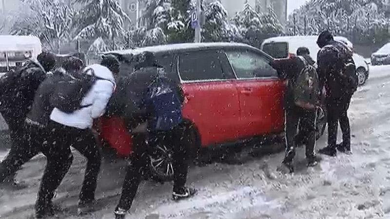 Başakşehir'de etkisini arttıran kar yağışının ardından bazı araçlar yolda kaldı. Patinaj yapan araçları öğrencilerin ittirerek kurtardığı anlar kameralara yansıdı.
