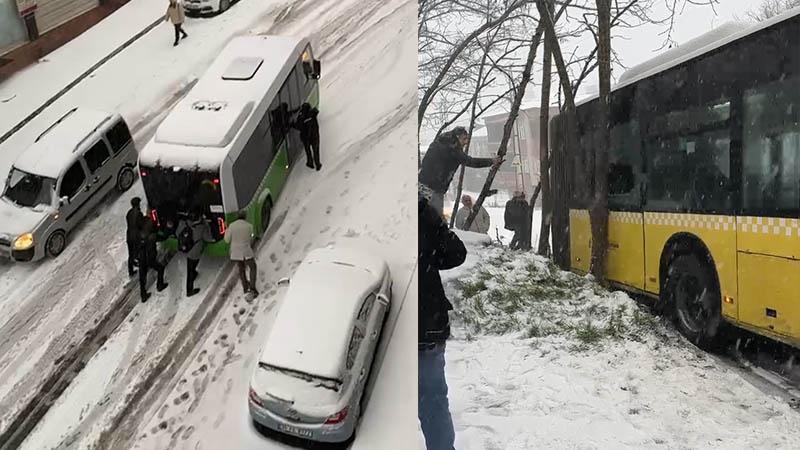 Başakşehir'de kar yağışının ardından kayan İETT otobüsü yol kenarında bulunan ağaca çarptı. Arnavutköy'de yolda kalan minibüsü ise yolcuları ittirerek kurtarmaya çalıştı.
