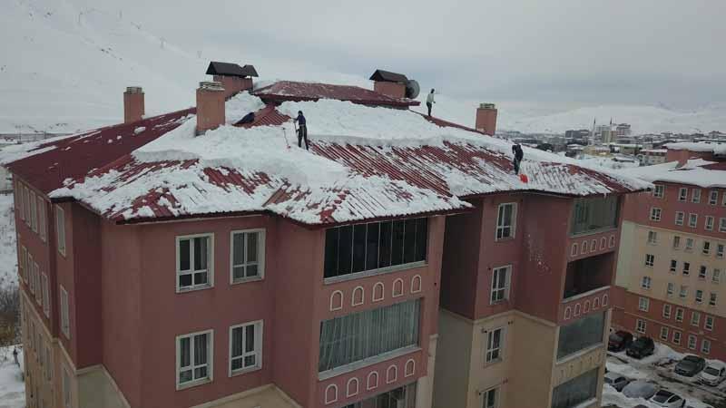 06:02Esenyurt'ta hafriyat kamyonunun çarptığı motokurye öldü; kaza kameradaTürkiye'nin en fazla kar alan yerleşim yerlerinden olan Bitlis'te yağış sonrası çatılarda biriken karlar tehlike oluşturuyor. Kış aylarında küreyiciler, belli ücret karşılığında çatılara çıkarak bellerine bağladıkları iplerle çatı ucuna kadar uzanıp, biriken karları düşürüyor. Soğuk havanın hüküm sürdüğü kentte küreyiciler, günde 1 ya da 2 binanın çatısını temizliyor. Genelde 3 kişilik ekip olarak çalışan küreyiciler, metrelerce yükseklikten düşmemek için kullandıkları ipin bir ucunu kendilerine, diğer ucunu bacaya bağlıyor. Çatıda 2 kişi kürekle karları temizlerken, diğeri bir noktaya bağlanan ipi tutarak güvenliklerini sağlamaya çalışıyor.