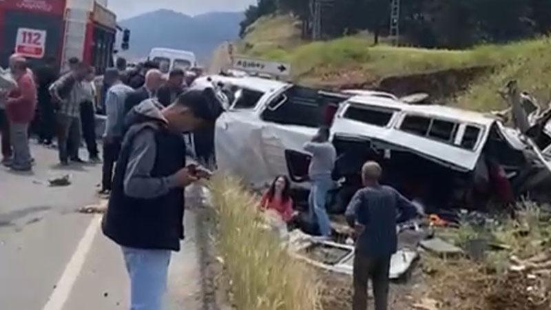 Çarpışmanın etkisi ile hurdaya dönen minibüs şarampole devrildi. Kazayı görenlerin ihbarı üzerine olay yerine çok sayıda sağlık, itfaiye ve polis ekipleri sevk edildi. İlk belirlemelere göre kazada minibüsteki 9 kişi öldü, 10 kişi de yaralandı. Ekiplerin olay yerindeki incelemesi sürüyor.