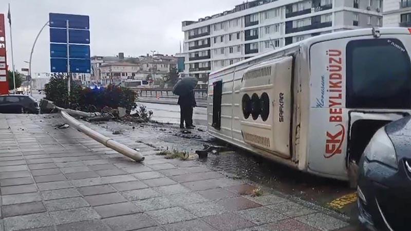 Diğer yandan yolcu minibüsünün yol kenarındaki aydınlatma direğine çarparak devrildiği anlar güvenlik kamerasına yansıdı. Görüntülerde yolcu mlnibüsünün bir süre yolda kaydığı ardından da karşı yola geçerek kaldırımdaki aydınlatma direğine çarptığı anlar görülüyor. Çarpmanın şiddetiyle yolcu minibüsün devrildiği anlar da görüntülerde yer alıyor.