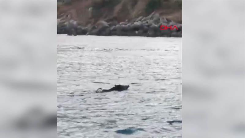 Kurucaşile ilçesinde dün akşam saatlerinde teknesi ile balığa çıkan Ahmet Açar, limandan yaklaşık 100 metre açıkta denizde yüzen yaban domuzu gördü. Açar o anları cep telefonuyla görüntüledi. Denize düştüğü tahmin edilen yaban domuzu, bir süre sonra gözden kayboldu. (DHA)