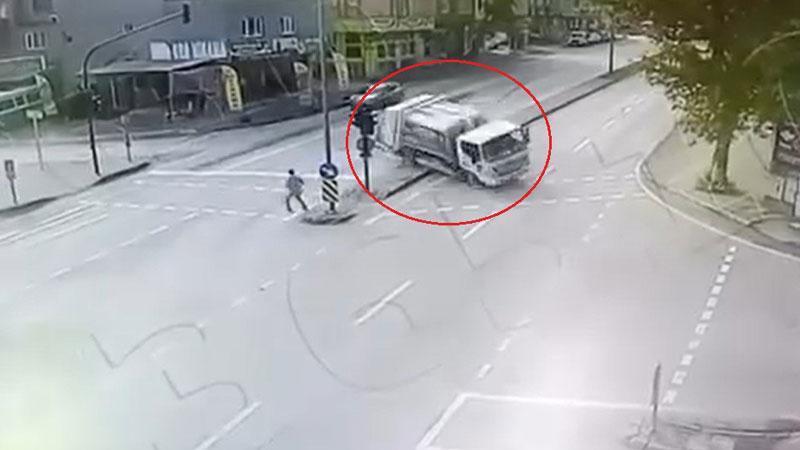 'da, bir yaya, refüje çarpıp karşı şeride geçtikten sonra devrilen çöp kamyonunun altında kalmaktan son anda