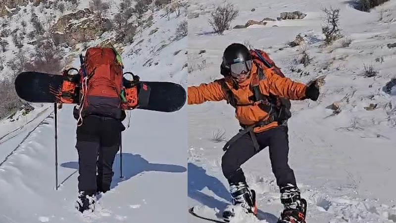 Diş hekimi tırmandığı dağdan snowboard yaparak indi