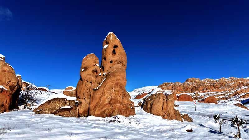Yüzeyindeki farklı oluşumları ile dikkat çeken kayalıklar, aynı zamanda ilkokuldan üniversiteye kadar tüm öğrencilere yerkürenin tarihi hakkında rehberlik edebilecek özellikleri taşıyor. Yüzeyinde çamur ve kum taşlarının oluşturduğu kızıllık nedeniyle farklılık gösteren ve özellikle yaz aylarında meraklıların sıkça ziyaret ettiği kayalıklarda kar yağışı sonrası ortaya çıkan manzara dron ile görüntülendi. Kar yağışı ile geniş bir alanı kaplayan kayalıkların yüzeyinde oluşan beyaz örtü, kızıl zeminle birlikte güzel görüntüler oluşturdu.