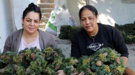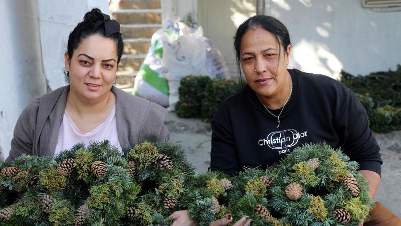 Üretici kadınlardan Canan Pehlivan (45), 10 yıldır çelenk yaptığını söyleyerek, "Önceden depolarda çalışıyorduk, sonra evlerimize verilmeye başlandı. Ailece, çocuklarımızla birlikte yapıyoruz. Çok zahmetli ama emeğimizin karşılığını alıyoruz. Günde 40-60 çelenk yapıyoruz. Erken başlarsak 60'ı buluruz" diye konuştu.
