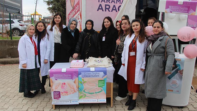 Etkinlikte konuşan İlçe Sağlık Müdürlüğü Halk Sağlığı Uzmanı Dr. Burcu Ecem Uğuz, 2025’te ücretsiz olarak yapılan 20 bin taramada 439 kişide pozitif sonuç saptandığını belirterek, “Vatandaşlarımızın ileri tetkik için hastanelerimize yönlendirmesi yapılmıştır. Rahim ağzı kanseri tarama için 30-65 yaş arasındaki tüm kadınlarımızı 5 yılda bir, meme kanseri taraması için ise 40-69 yaş aralığındaki kadınlarımızı 2 yılda bir taramalarını gerçekleştirmekteyiz. Buna ek olarak kolon kanseri taraması için de 50-70 yaş arasındaki hem kadın hem erkek tüm vatandaşlarımızı KETEM merkezlerimize bekliyoruz. Hedef nüfusumuzdaki tüm vatandaşlarımıza telefonla ulaşıyoruz. Onları merkezlerimize davet ediyoruz. Evleri uzak olan vatandaşlarımızı ilçe sağlık müdürlüğümüze bağlı araçlarımızla da evlerinden alıp hem mobil kanser tarama TIR’ımızda hem de KETEM merkezimize getirerek tarama gerçekleştiriyoruz. Sonrasında da evlerine bırakıyoruz. Bu hizmetlerimizi ücretsiz bir şekilde yapmaktayız. Erken tanı hayat kurtarır” diye konuştu.