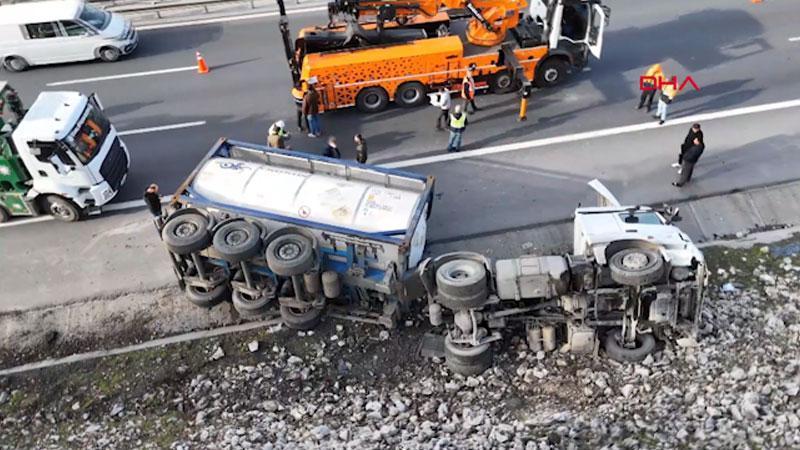 Esenyurt TEM Otoyolu'nda tanker devrildi; trafik yoğunluğu oluştu
