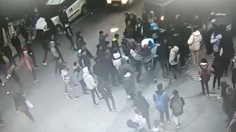 01:24Adliye önünde tekmeli-yumruklu kavga kameradaOlay, 17 Mart Perşembe Esenyurt Yunus Emre Mahallesi'nde bulunan bir lisenin önünde meydana geldi. Edinilen bilgiye göre, öğrencilerin çıkış saatinde aralarında lise öğrencisinin de bulunduğu bir grup okul önüne gelerek, daha önceden aralarında husumet bulunan M.M.K. (14) isimli liseli gencin okuldan çıkmasını bekledi. Bir süre sonra okuldan çıkan M.M.K, husumetlilerinin bıçaklı saldırısına uğradı. İki bacağından bıçakla yaralanan genç kaçmaya başlarken, saldırganlardan biri belinden çıkardığı tabancayla rastgele ateş etmeye başladı.