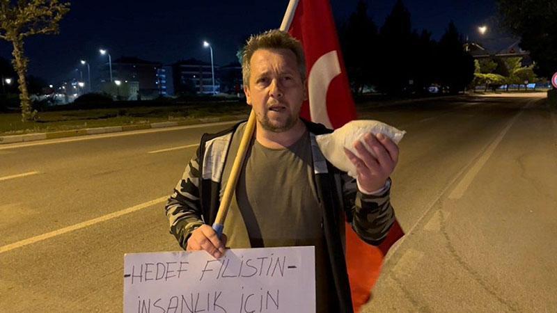 İsrail’in Gazze’ye yönelik ablukası nedeniyle çok üzgün olduğunu ifade eden Başkaya, 2 aydır rahat uyuyup, yemek yiyemediğini söyleyerek, “Ben şu an burada Filistin Gazze’de yaşanan zulme karşı yürüyüş yapıyorum. Bu düşünce 2 aydan beri benim aklımda vardı, eşimle, dostumla paylaştım. Artık halkın harekete geçmesi gerekiyor. Ben basit bir insanım, esnafım ama ben 2 aydır evimde rahat uyuyamıyorum, yemek yiyemiyorum. Artık yeter, bu İsrail’i kim durduracak? Eğer Avrupa ve Amerika durduramıyorsa, kimseler durduramıyorsa halk olarak bizler durduralım. Savaş için değil, barış için yürüyelim. Bizim amacımız İsrail’e gidip de savaşmak değil ama bu mazlum insanları niye öldürüyor? Bu insanlar ne yaptı? İbrahim Peygamber’e karınca tarafından taşınan suyun hikayesini herkes biliyor, anlatmaya gerek yok. Ben de o misal elime un aldım, bu yazıyı da yazdım. Karınca misali bu unu, Allah nasip ederse Filistinli kardeşlerime, Gazze’deki kardeşlerime temsili olarak götüreceğim. Belki bu bir işe yaramayabilir ama Türkiye’de 86 milyon nüfusumuz var. 10 milyon insan benimle beraber Suriye sınırına şu kadar un getirse ve bu Netanyahu denilen alçak şu 10 milyon Türk’ü, Müslüman’ı veya vicdan sahibi insanı görünce bir barış imzalasın artık. O da farkına varsın” diye konuştu.