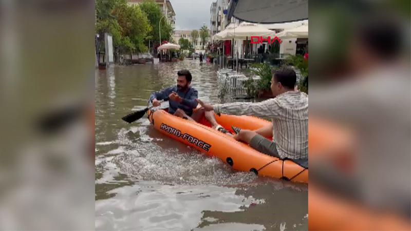 Fethiye'de sağanak: göle dönen yollarda kano ile ilerlediler