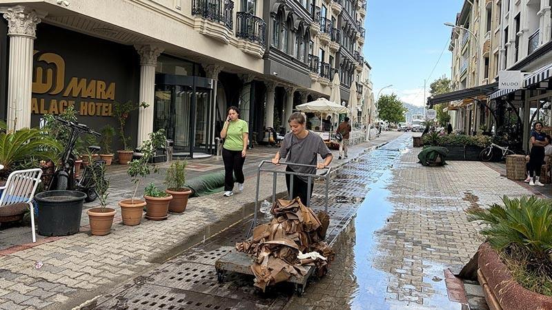 Fethiye'de dün etkili olan sağanağın ardından ilçe merkezinde temizlik çalışmaları başlatıldı. Sabah saatlerinden itibaren sular altında kalan 70 iş yerinin sahibi, belediye ekipleri ile birlikte temizlik yaptı. Dispanser Sokak ve çevresinde etkili olan yağış sonrası cadde ve dükkanlarda biriken çamur, Fethiye Belediyesi Temizlik İşleri Müdürlüğü ekipleri tarafından temizlendi. Esnaf, iş yerlerinde biriken suyu tahliye ederek zarar gören eşyalarını dışarıya çıkardı. Belediye görevlileri, yağışın etkilediği diğer bölgelerde de temizlik ve hasar tespit çalışmalarını sürdürüyor. (DHA)