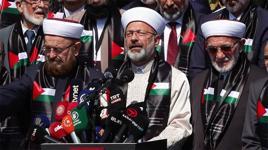 Programa katılan Diyanet İşleri Başkanı Ali Erbaş, “Dünyanın 50 ülkesinden 150’yi aşkın ilim insanı Gazze için yapılabilecekleri, yapılması gerekenleri müzakere etmek üzere İstanbul’da kapsamlı bir konferans düzenlediler. Eyüp Sultan Camii’nde cuma namazının ardından bir basın toplantısıyla açılışı yapılan söz konusu çalışma hafta içi devam etti ve sona erdi. Kurulduğu günden beri gerçekleştirdiği cinayetlere sessiz kalınmasından cesaret alan Filistin’deki işgalci siyonist rejim, kirli emelleri uğruna Gazze’de tam anlamıyla bir soykırım yapıyor. Bu alçakça saldırı ve soykırım karşısında bazı dünya devletleri, adeta siyonist işgalci tarafından esir alınmışçasına doğrudan ya da dolaylı olarak katillere destek oluyor. Bir avuç azgın ve sapkın topluluk tüm dünyayı topyekûn bir felakete sürüklüyor” dedi.