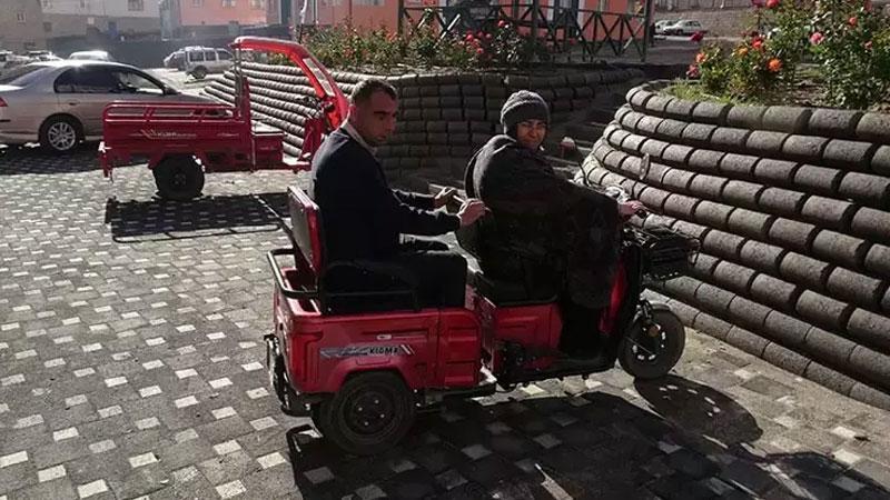 Hatice Güngörmez ise “Sabah kahvaltısını hazırlıyorum. Üzerini giydiriyorum. Her ihtiyacını karşılıyorum. Sabah işine götürüyorum. 1 kilometre gidiş 1 kilometre geliş günlük 6 kilometre gidiyorum. Çünkü öğlen de gidip yemek yemesi için geri eve getirip işe karnını doyurduktan sonra işe bırakıyorum. Kışları çok sıkıntı oluyor. Üstü açık olduğu için onun üzerine eğer bir naylon gibi, çadır gibi bir şey olursa yazları sıkıntı olmuyor ama kışları çok sıkıntı yaşıyoruz. Ben de üşüyorum. Eşimin iş arkadaşları da ben olmadığım zaman Allah razı olsun idare ediyorlar. Ben olmadığım zaman ya da rahatsız olduğum zaman gidemediğim, getiremediğim zaman iş yerinden sağ olsunlar onlar getiriyorlar. Bana hiçbir engeli olmuyor. Mutlu bir şekilde yaşayıp gidiyoruz. Birbirimize destek oluyoruz. Engelli olmak bireylerin ayıbı değil engel herkesin başına gelebilecek bir durum” ifadelerini kullandı.