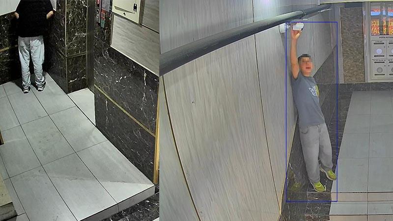 Olay, iş hanının güvenlik kamerasına yansıdı. Görüntülerde içeri giren iki kişiden biri asansörün köşesine tuvaletini yaparken, diğerinin ise kameranı açısını değiştirdiği yer alıyor.