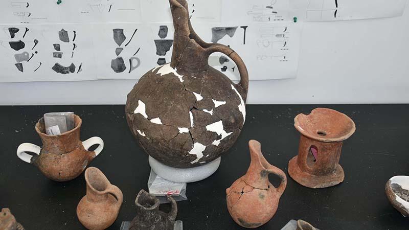 "Elde yapılmış çanak çömlekler içinde farklı boyutta da olsa testi ve testicik türündeki eserlere rastladık. Testilerin hayvanı sembolize eden gaga ağız yani ördek formunda yapılmış ağız kısımları dikkati çekmektedir. Bunların çoğu sıvı kabı. Bunun dışında 'tankart' dediğimiz iki kuplu maşrapa tarzında bir kap keşfettik. Kapların içinde en dikkat çeken buluntu ritüel kabıdır. İki ayrı kapı birleştirip tek bir kap şeklinde yapmışlar. Yemek içmek gibi değil törenlerde özel sıvıları dökmek için şekillendirdikleri kadın ve erkeği temsil edebileceğini düşündüğümüz bir kap. Üzerindeki desen çizgilerin içi beyaz boya ile doldurulmuş. Aynı zamanda bu eserlerde tekstilin de nasıl yansıdığını görebiliyoruz."
