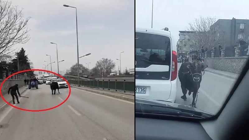 Duran trafikte, bir süre araçların arasında dolaÅŸan boÄŸa, kendisini yakalamak isteyen ekiplerin elinden kaçarak gözden kayboldu. (DHA)
