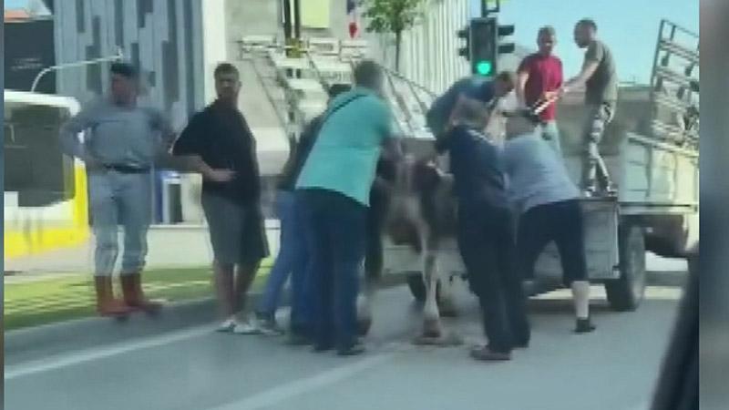 Mahmudiye Mahallesi’nde ise yine sahibinin elinden kaçan bir boğa, cadde üzerinde seyir halindeki araçların arasına daldı. Trafikte kısa süreli paniğe neden olan boğa, sahiplerinin kamyonetle takibi sonucu yakalandı. Boğa, kamyonete bindirilerek kesim yerine götürüldü. (DHA)