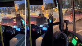 06:02Esenyurt'ta hafriyat kamyonunun çarptığı motokurye öldü; kaza kameradaKadıköy'de önceki gün akşam saatlerinde seyir halindeki İETT otobüsü, uzun süre bir otomobil sürücüsü tarafından sıkıştırıldı. Otobüs şoförünün tepki göstermesi üzerine sürücü, otomobiliyle İETT otobüsünün önünü keserek durdurdu. Otobüsteki yolcular otomobil sürücüsüne tepki gösterdi. Bu sırada otobüsten inen bir yolcu da sürücüyle tartıştı. Çevredekilerin araya girmesiyle direksiyona geçen sürücü, otomobilini yolcunun üzerine sürdü. Yaşanan tartışma ve sürücünün otomobilini yolcunun üzerine sürdüğü anlar, çevredekiler tarafından cep telefonu kamerasıyla kaydedildi.
