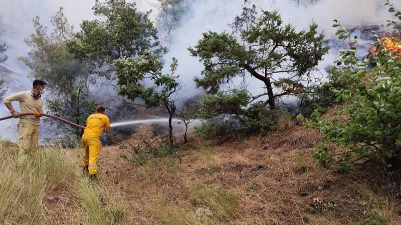 Yangın çıkan bölgenin dağlık bir arazi yapısına sahip olması ve kuvvetli rüzgar, ekiplerin alevlerle mücadelesini güçleştiriyor.