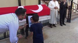 Hatay’ın Reyhanlı ilçesinde arkadaşlarıyla halı sahada maç yaparken kalp krizi geçiren polis memuru Murat Kına (32) hayatını kaybetti. Kına, düzenlenen törenle toprağa verildi. Kına'nın 5 yaşındaki oğlu Hüseyin Mert, babasını, Türk bayrağına sarılı tabutu önündeki fotoğrafını öpüp, el sallayarak uğurladı.