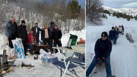 Kar üstünde piknik; mangal yakıp, otomobilin çektiği kızaklarla kaydılar