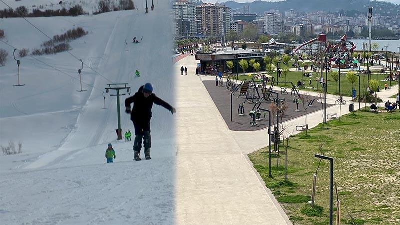 Küresel iklim değişikliği ve kuraklığın etkileriyle yağış rejimi değişen Doğu Karadeniz’de sahil bölümündeki kentlerde bahar havası görülürken, nisan ayında yağan karla beyaza bürünen yüksek kesimlerdeki tesislerde ise kayak yapılıyor. Vatandaşlar sahil kesiminde piknik, yürüyüş ve spor yaparak güzel havanın keyfini çıkarıyor. Bayburt’ta deniz seviyesinden 2409 metre yüksekteki Kop Dağı’nın karla kaplı zirvesine çıkanlar ise kayak yapıyor. Yaz ve kış sporlarının aynı günde yapılabildiği bölge yerli yabancı turistlerin ilgi odağı oluyor.