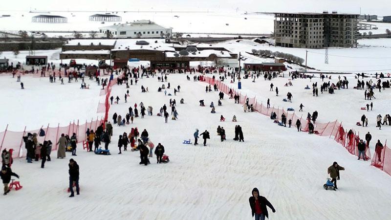 de kayakseverlerle dolup taştı. Yoğunluk dron kamerasına yansırken; merkeze gelenler, kayak ve snowboard yaparak karın keyfini çıkardı.