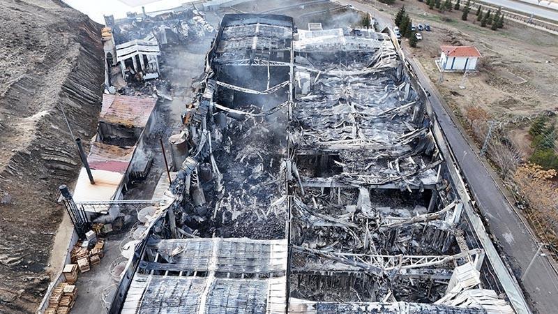 Yangının ardından enkaz yığını haline gelen fabrika havadan dronla görüntülenirken, soruşturma sürüyor.