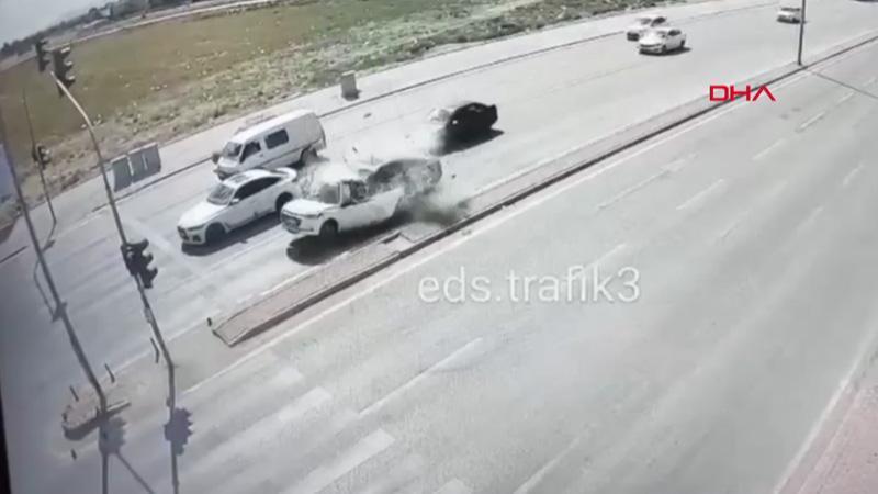 Kaza, saat 13.30 sıralarında Meram ilçesi Antalya Çevreyolu Caddesi'nde meydana geldi. Kırmızı ışıkta bekleyen Mevlüt Külcü'nün (40) kulllandığı 42 BT 341 plakalı otomobile, İsmail Andaç'ın (41) yönetimindeki 42 ATT 900 plakalı otomobil arkadan çarptı. Mevlüt Külcü'nün otomobili savrularak refüjdeki aydınlatma direkleri ve ağaca çarparak ikiye ayrıldı. Andaç'ın kullandığı otomobil ise yaklaşık 200 metre sonra elektrik panosuna çarptı. İhbarla kaza yerine sağlık, itfaiye ve polis ekipleri sevk edildi. Ekipler ağır yaralanan Mevlüt Külcü'nün olay yerinde hayatını kaybettiğini belirledi. Diğer otomobilin sürücüsü İsmail Andaç ise yaralandı. Andaç ambulansla Konya Şehir Hastanesi’ne kaldırıldı. Külcü'nün cesedi de otopsi yapılmak üzere Konya Adli Tıp Kurumu'na götürüldü. Diğer yandan kaza, güvenlik kamerasına yansıdı. (DHA)