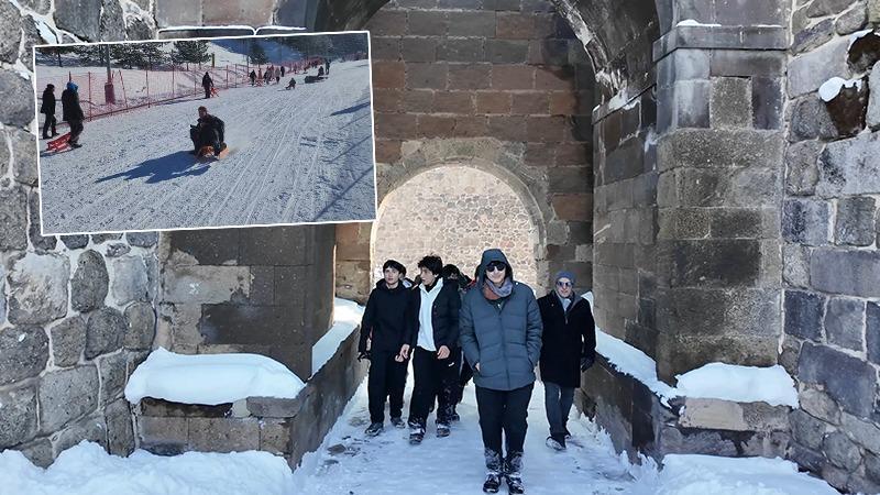 04:56Geçen haftaki yağış ve hortumun Antalya'ya faturası 300 milyon TLSamsun Büyükşehir Belediyesi tarafından tahsis edilen otobüsle yola çıkan Terme Lisesi’nde görev yapan 6 öğretmen ile 20 öğrenci, karlar altındaki Erzurum'da ilk olarak 23 Temmuz 1919'da Atatürk başkanlığında yapılan kongreye ev sahipliği yapan binayı gezdi. Erzurum'dan rehberler yardımıyla kongre ve alınan kararlarla ilgili bilgi alan öğrenciler, Lalapaşa Camii ile Yakutiye Medresesi, Üç Kümbetler, Çifte Minareli Medrese, Erzurum Kalesi'ni ziyaret etti. Tarihi saat kulesine çıkan öğrenciler, yaklaşık 30 metre yükseklikten karlar altındaki Erzurum'u izledi. Oltu taşı ürünlerin satıldığı Bedesten Çarşısı'nı da gezen öğrencilerin son durağı Palandöken Kayak Merkezi oldu. Erzurum Büyükşehir Belediyesi iştiraklerinden Ejder 3200 A.Ş. tarafından gondol liftle kayak merkezi gezdirilen öğrenciler, Erzurum Valiliği tarafından temin edilen kızaklara binerek eğlendi. Düşe kalka kayak yapan öğrenciler, tarih ve eğlence dolu bir geziye katılmaktan mutlu olduklarını ifade etti.