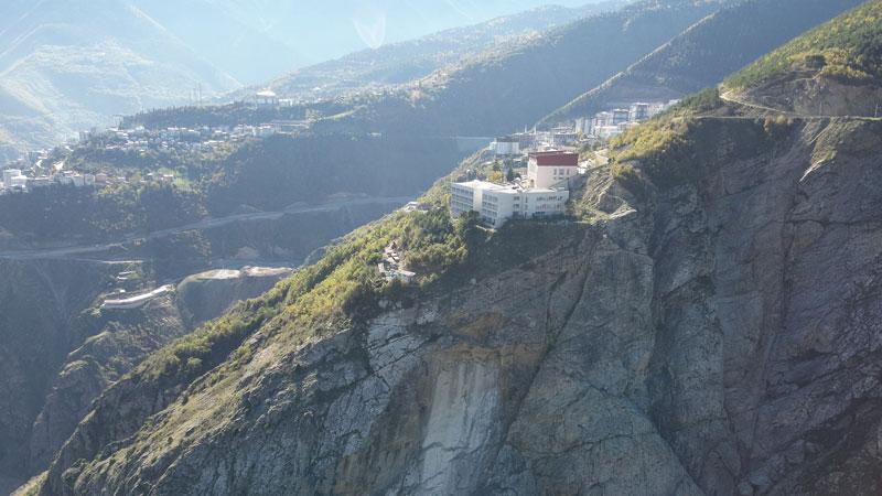 Kayaların koptuğu dik yamaçta ekiplerinin incelemeleri sürüyor. Kapsamlı incelemeler sonrası tedbirlerin alınacağı bölge dronla görüntülendi. Tahliye edilen yamacın üst bölümündeki lisede 1 günlük aranın ardından eğitime yeniden başlandı. (DHA)