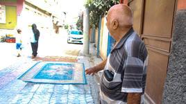 ’nın Gülpınar Mahallesi’nde oturanlar, uzun süredir onarılmayan yolların bozuk olması nedeniyle kalkan tozdan korunmak için sokaklara halı serdi.