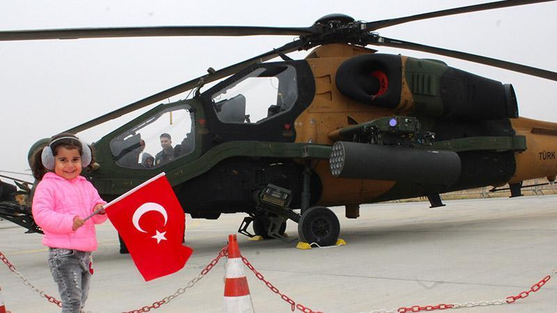 Türk mühendisleri tarafından üretilen yeni nesil yerli ve milli silah sistemlerini ziyaret eden öğrencilerden Sevgi Başak, Azra Gürükmez, Senanur Tatar yerli ve milli üretim olan envanterleri gördükleri için hem mutlu hem de gurur duyduklarını ifade etti. ATAK helikopterler de sergi ziyaretine gelen ziyaretçiler için gösteri uçuşu yaptı. (DHA)