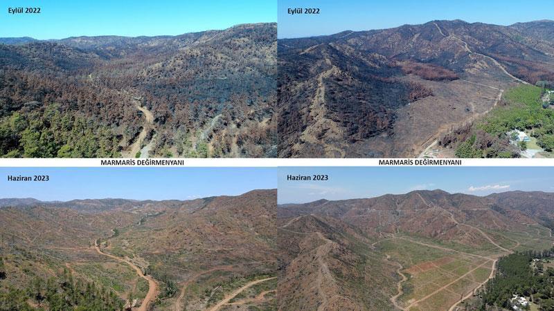 Muğla Orman Bölge Müdürlüğü'nce yangın sonrası bölgede çalışmalara hemen başlandı. Bördübet ve Değirmenyanı'ndaki yanık sahalar, üretim çalışmaları kapsamında yanan ağaçlardan hızla temizlendi. İlk fidanlar 11 Kasım'da Milli Ağaçlandırma seferberliği kapsamında toprakla buluşturuldu. Bölgede yanan alanların geri kalan kısmında doğal ve suni gençleştirme yöntemi uygulandı. Tohum atma ve dal serme çalışması yapılan alanlarda fidanlar yükseldi. Yangının birinci yılında yanan alanlarda yapılan çalışmalar, dron ile havadan görüntülendi. Yangından hemen sonra ve 1 yıl sonra aynı noktada çekilen görseller, alandaki değişimi gözler önüne serdi.