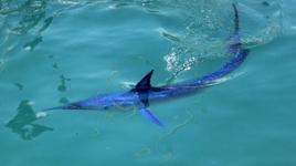 Dünyanın en hızlı deniz canlısı olarak Guinness Rekorlar Kitabı'na giren ve soyu tükenme tehlikesiyle karşı karşıya olan yavru mavi yelken balığı (Marlin Fish Spearfishing), Antalya'nın Kemer ilçesinde görüntülendi.