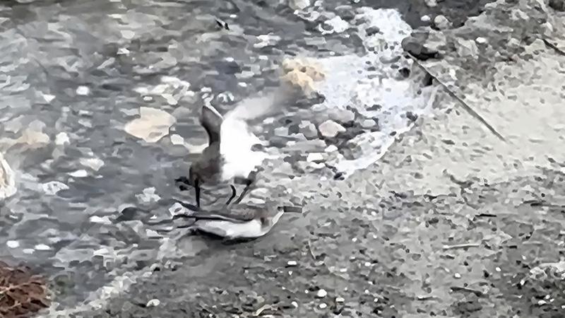 Hatay'ın Samandağ ilçesindeki Milleyha Sulak Alanı'nda yiyecek kapmaya çalışan 2 kara karınlı kum kuşunun birbiriyle mücadele ettiği anlar, görüntülendi.