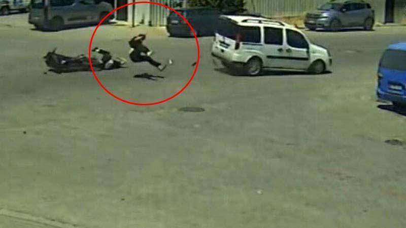 Aydın'ın Efeler ilçesinde, hafif ticari araçla çarpışan motosikletteki 1'i ağır, 2 kişi yaralandı. Kaza, güvenlik kamerasına yansıdı.