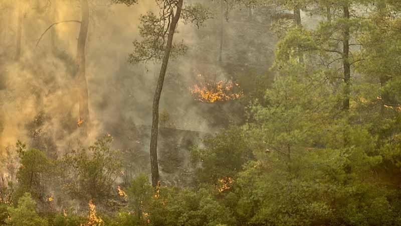 Muğla'nın Köyceğiz ilçesinde çıkan orman yangınını söndürme çalışmaları havadan ve karadan sürerken, yanan alanlar dronla görüntülendi. Görüntülerde, geniş bir alanın küle döndüğü, bazı bölgelerden ise dumanların yükselmeye devam ettiği görüldü.