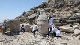 Doğu terasında yer alan Apollon heykelinin başlık kısmındaki, geçmişte farklı gruplar tarafından yapıştırılmış ve sonrasında ayrılmış olan parça, bu kez kalıcı şekilde birleştirildi. Böylece Nemrut’un simge eserlerinden biri yeniden bütünlüğüne kavuştu. Nemrut Dağı Tümülüsü'nün dev heykelleri için planlanan sağlamlaştırma projesi, beş yıllık bir yol haritasıyla ilerleyecek. Bakanlığın 2022 yılında başlattığı deneme çalışmaları ve 2023-2024 yıllarındaki kontrollerin ardından, bu yaz başlayan uygulamalar Nemrut'un geleceğini güvence altına alacak. (DHA)