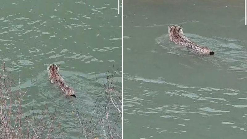 Nesli tehlike altında olan vaşak, çaydan geçerken görüntülendi