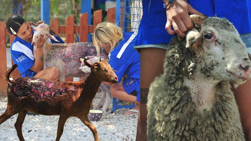 Çanakkale ve İzmir'in Ödemiş ilçesinde çıkan orman yangınlarından etkilenen 2 kuzu ile 13 koyun, Hayvan Hakları Federasyonu (HAYTAP) üyeleri tarafından ilk müdahaleleri yapıldıktan sonra Bursa'daki Emekli Hayvanlar Çiftliği'ne getirildi.