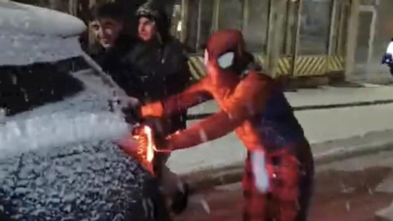 'Örümcek Adam', karda mahsur kalan sürücüye yardım etti
