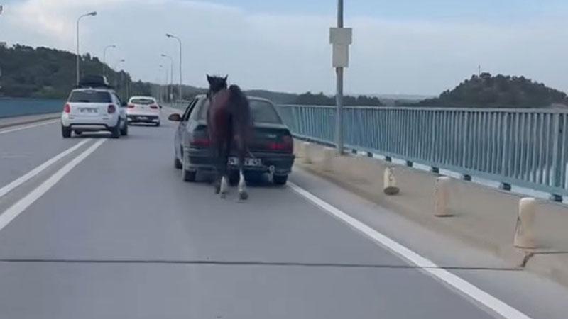Otomobile bağladığı at ile ilerledi; 2 gözaltı