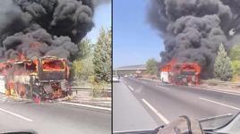 09:03Güngören'de 6 katlı binada patlamaIrak’tan İstanbul’a giden M.B. yönetimindeki 16 KK 410 plakalı yolcu otobüsü, Tarsus-Pozantı Otoyolu Damlama mevkiine geldiğinde motor kısmında duman çıkmaya başladı. M.B. otobüsü emniyet şeridine çekerek 7 yolcu ve 2 personeli tahliye etti. İhbar üzerine bölgeye sevk edilen itfaiye ekipleri, alev alev yanan otobüse müdahale etti. Yangın yol kenarındaki ağaçlara da sıçradı. Ekiplerin hızlı müdahalesiyle otobüs ve ağaçlık alandaki yangın kontrol altına alındı. Yoldan geçen sürücüler tarafından cep telefonuyla görüntülenen otobüsteki yangının çıkış nedeninin belirlenmesi için inceleme başlatıldı.
