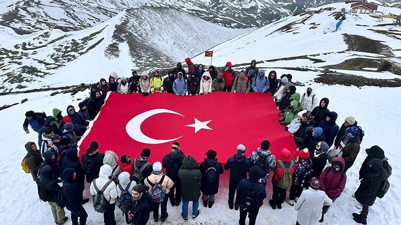 Güneşli havada başlayan dağda otlayan inek sürüsünün arasından geçip, zaman zaman kar ve dolu yağışı altında karlı zeminde, tek sıra halinde yürüyen grup, Palandöken'in 2 bin 900 rakımında, 10 dakika mola verdi. Dağcılar burada, 'selfie' yaparak, Atatürk'ü Anma, Gençlik ve Spor Bayramı'nın 105'üncü yıl dönümünü ölümsüzleştirdi. Palandöken'in 3 bin 176 metredeki zirvesine çıkan öğrenciler, dev Türk bayrağı açıp, saygı duruşunda bulunduktan sonra İstiklal Marşı'nı okuyarak, inişe geçti. Tırmanışa katılan Atatürk Üniversitesi Tıp Fakültesi birinci sınıf öğrencisi Elif Rana Çörek, "Böylesine anlamlı bir günde burada olmak güzel bir duygu. Zirve karlı olduğu için zorlu bir tırmanış bizi bekliyor. Hem Atatürk'ü anma adına hem de spor adına çok güzel bir aktivite olacak" diye konuştu.