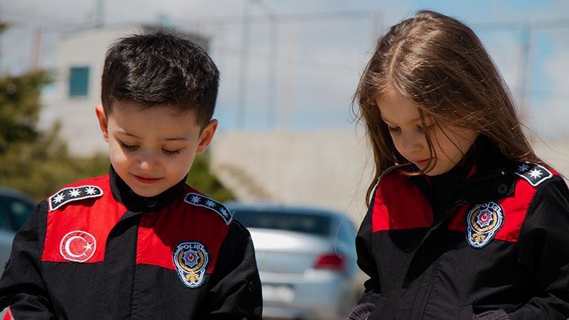 Birbirleriyle telsizle iletişim sağlayan çocuk polisler Emniyet Müdürlüğü'nün bahçesinde kurulan uygulama noktasında akülü araçları durdurup ehliyet kontrolü de yaptı.