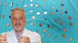 Prof. Dr. Mustafa Akçam, hastalarının yuttuğu ve yemek ya da soluk borusundan operasyonla çıkarttığı cisimlerden koleksiyon yaptı. Mideden ya da nefes borusundan çıkartılan yabancı cisimler arasında para, toka, çivi, çatal iğne, küpe, yüzük, karabina, pil, oyuncak yer aldı. Yabancı cisim yutma ya da nefes borusuna kaçma şikayetiyle gelen hastaların çoğunlukla çocuklar olduğunu belirten Prof. Dr. Akçam, 10 yılda yaklaşık 350 çocuktan yabancı cisim çıkardık. Yemek borusunda cisim takılı kaldığı için yemek yiyemeyen, salyası devamlı dışarıya akan veya nefes borusuna kaçıp devamlı öksürük, solunum sıkıntısı olan çocuklarla karşılaşıyoruz dedi.